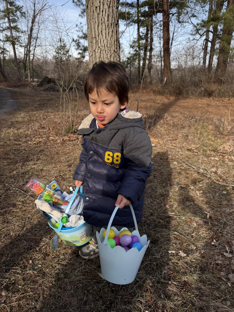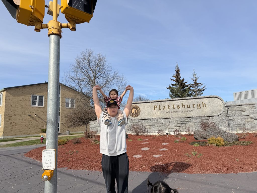 早上出门时,我先给壮壮穿好了滑雪鞋,然后把他背在前面,再背上包。我把自己的雪鞋挂在脖子上,一手拿着壮壮的雪板,一手拿着我的雪板,就这样艰难地走了出去。