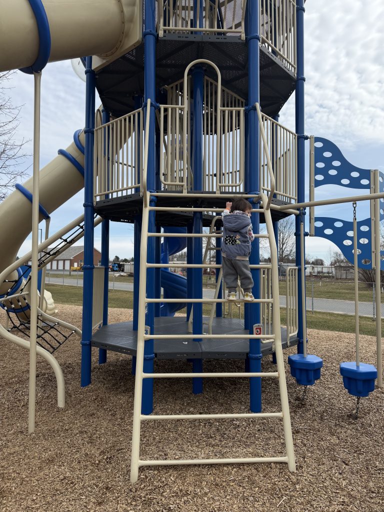 刚到雪场,更艰难的部分才开始。**从雪具大厅到初学者魔毯还有一公里的上坡路。**因为现场没有儿童背带,我只能: